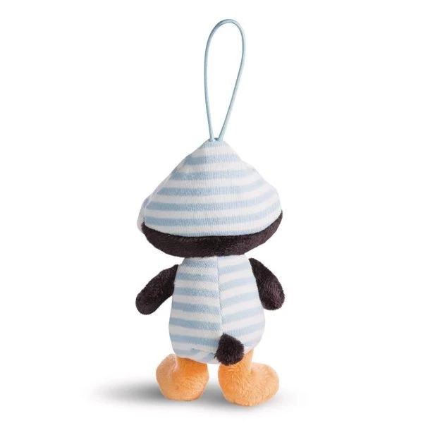 Plüsch Pinguin Koosy von den NICI Schlafmützen als süßer Schlüsselanhänger. Das schwarz-weiße Kerlchen trägt einen Pyjama mit Streifen und eine dazu passende Mütze. Die breite Krempe der Mütze lässt sich über die Augen klappen, dann sieht es so aus, als würde Koosy schlafen, denn auf der Außenseite sind zwei geschlossene Augenlider aufgenäht. Für alle Kinder, die sich von Koosy als Kuscheltier abends ins Traumland begleiten lassen, ist dieser Anhänger die perfekte Ergänzung.