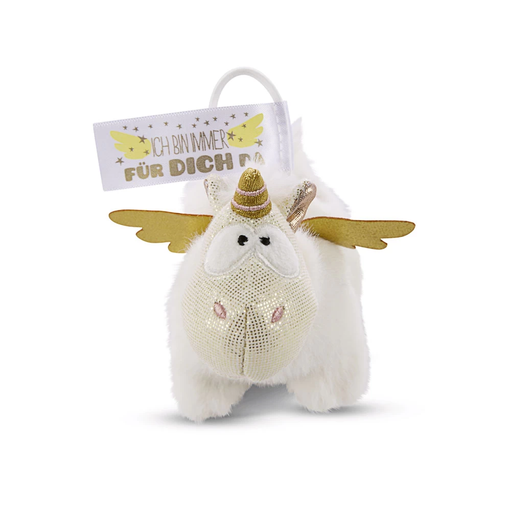 Der Anhänger Einhorn-Engel Angelia “Ich bin immer für dich da” ist super detailverliebt: Goldene Flügel, eine Harfen-Bestickung auf der Einhornflanke, das gold-schimmernde Einhorn-Gesicht und der flauschige Hoodie, den Angelia trägt. Einfach super süß! Mit Hilfe des elastischen Loops kannst du Angelia fast überall befestigen.